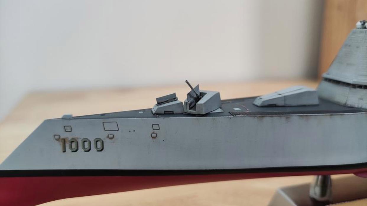 朱姆沃尔特级驱逐舰的主炮(模型展示)相对比之下,我国055大驱使用的主炮口径都只有130毫米,且055大驱也只有1门主炮。